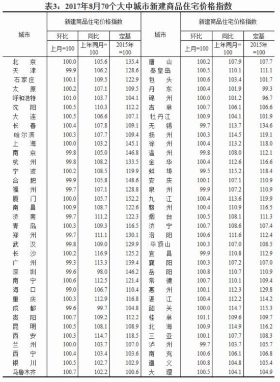 2017年8月70個大中城市新建商品住宅價格指數。來源:國家統計局