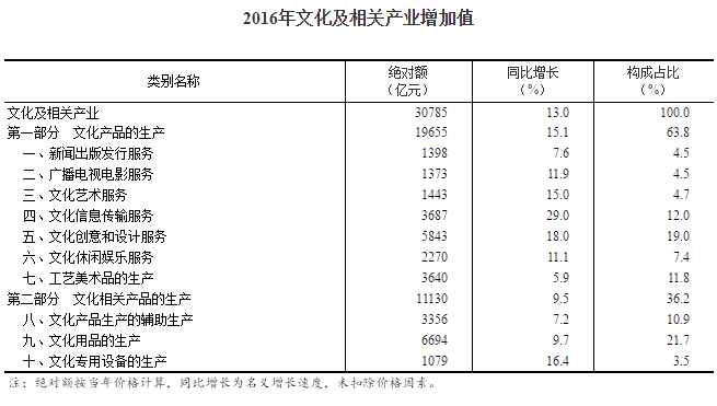 數據顯示,根據《文化及相關產業分類(2012)》和《文化及相關產業增加值核算方法》的規定和要求,經核算,2016年全國文化及相關產業增加值為30785億元,比上年增長13.0%(未扣除價格因素,下同),比同期GDP名義增速高4.4個百分點;占GDP的比重為4.14%,比上年提高0.17個百分點。2016年文化及相關產業保持平穩快速增長,比重穩步上升,對促進經濟轉型升級、平穩健康可持續發展發揮了重要作用。