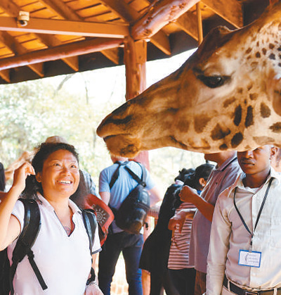 | 近年來,春節(jié)期間前往非洲旅游的中國游客逐漸增多。今年春節(jié)期間,在肯尼亞首都內(nèi)羅畢的長頸鹿中心,一名中國游客和長頸鹿互動。 |