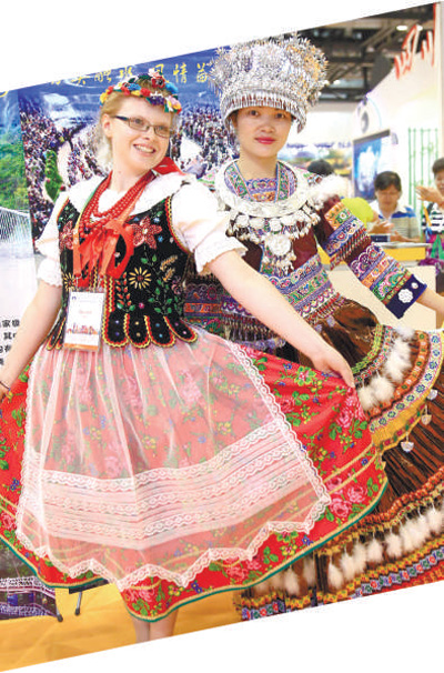 | 在2017北京國際旅游博覽會上,來自波蘭的安娜(左)和來自廣西柳州市融水苗族自治縣的張鳳媚合影留念。 |