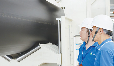 泉恩管業工作人員正在查看大口徑PE生產線激光噴碼作業。Hkc安康新聞網