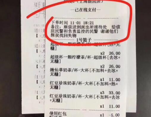民警四處詢問了下,沒人下過單,快遞小哥連忙遞上手中的外賣單,上面寫著:麻煩送到派出所接待處,給值班民警和負責監控的民警,謝謝他們幫我找回失物。
