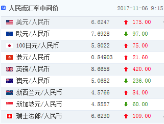 中國人民銀行授權中國外匯交易中心公布,2017年11月6日銀行間外匯市場人民幣匯率中間價為:1美元對人民幣6.6247元,1歐元對人民幣7.6928元,100日元對人民幣5.8022元,1港元對人民幣0.84903元,1英鎊對人民幣8.6658元,1澳大利亞元對人民幣5.0682元,1新西蘭元對人民幣4.5766元,1新加坡元對人民幣4.8557元,1瑞士法郎對人民幣6.6230元,1加拿大元對人民幣5.1922元,人民幣1元對0.63912馬來西亞林吉特,人民幣1元對8.8913俄羅斯盧布,人民幣1元對2.1441南非蘭特,人民幣1元對168.31韓元,人民幣1元對0.55429阿聯酋迪拉姆,人民幣1元對0.56597沙特里亞爾,人民幣1元對40.3678匈牙利福林,人民幣1元對0.55153波蘭茲羅提,人民幣1元對0.9672丹麥克朗,人民幣1元對1.2724瑞典克朗,人民幣1元對1.2322挪威克朗,人民幣1元對0.58621土耳其里拉,人民幣1元對2.8929墨西哥比索。JxD安康新聞網