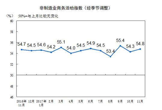 人民網北京11月30日電 據國家統計局網站消息,2017年11月份,中國非制造業商務活動指數為54.8%,比上月上升0.5個百分點,持續位于擴張區間,非制造業延續平穩較快的增長態勢,增速有所加快。