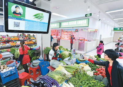 | 2017年11月29日,在安徽合肥瑤海區勝利智能農貿市場,市民在掃碼支付。 |
