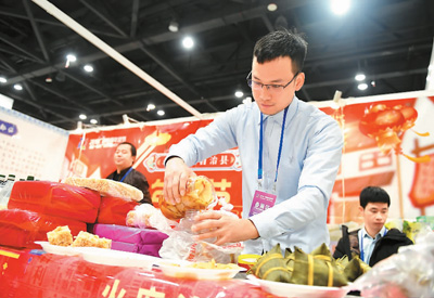 | 廣西電商年貨節日前在南寧舉行。圖為一名參展商準備將產品給顧客品嘗。 |
