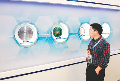 2017年10月25日,在上海舉辦的中國電子展上,參觀者在觀看一個由納米光罩和晶圓凸塊等芯片制造材料組成的展示墻。kpF安康新聞網