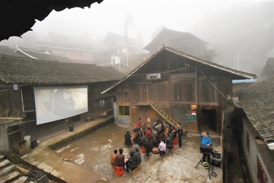 | 在南康侗寨的一戶村民家門口,有一塊大約半個籃球場大的曬谷場空地,肖錦生取出長繩往門楣上掛去,然后拉直、打結、綁緊,不到十分鐘,一張大銀幕掛了起來。在確定電影機位后,他嫻熟地架起放映機,接電源、調試音響,認真地操作著每一個環節。 |