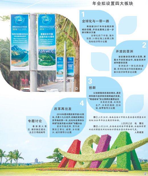 博鰲亞洲論壇2018年年會(huì)將于4月8日至11日舉行,主題為“開(kāi)放創(chuàng)新的亞洲 繁榮發(fā)展的世界”。年會(huì)將聚焦改革、開(kāi)放、創(chuàng)新以及全球化和“一帶一路”等議題,為亞洲的進(jìn)一步開(kāi)放、聯(lián)動(dòng)、創(chuàng)新發(fā)展建言獻(xiàn)策,為世界經(jīng)濟(jì)穩(wěn)步復(fù)蘇凝心聚力