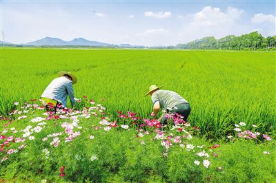4月2日,博鰲國家農業公園內,繁花盛開,水稻郁郁蔥蔥,農戶在地里忙碌著。本報記者 袁琛 攝
