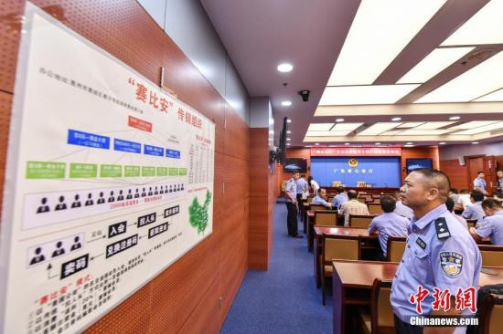 資料圖:廣東省公安廳內展示的“賽比安”網絡傳銷組織架構圖。中新社記者 陳驥旻 攝