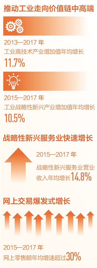 工業高技術產業、工業戰略性新興產業保持較快增長,推動工業向價值鏈中高端發展。2013—2017年,工業高技術產業增加值年均增長11.7%,高于全部工業年均增速5.1個百分點;2015—2017年,工業戰略性新興產業增加值年均增長10.5%,高于同期全部工業年均增速4.4個百分點。