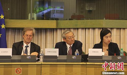 圖中為張明,左一為歐洲議會(huì)對華關(guān)系代表團(tuán)團(tuán)長喬·萊恩。 中新社記者 德永健 攝
