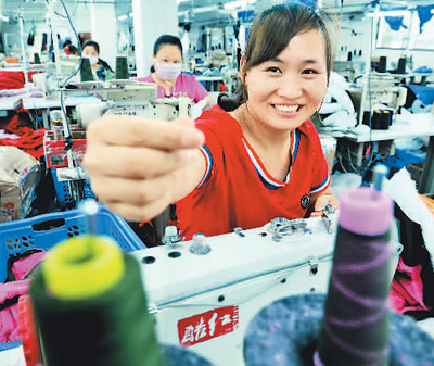 江西省鄱陽縣石門街鄉農家服飾是一個年出口50萬件各類服飾的民營企業。近年來,企業專門加工制造各類服裝,俏銷非洲各國,實現年產值2000多萬元。圖為石門街鄉農家女工正在趕制出口的服飾。