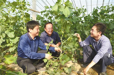 為進一步鞏固和加強基層黨組織建設,打贏脫貧攻堅戰,今年以來,山東臨邑縣選派120名優秀年輕干部駐村幫扶,實行鄉鎮考勤、村里辦公,建立健全縣、鄉、村三級扶貧網格。駐村干部精準制定扶貧方案,推進基層組織轉化升級,推動社區(村)脫貧致富。圖為日前,派駐臨盤街道前楊村駐村干部崔磊(右一)在扶貧產業園了解果蔬種植情況。 3eW安康新聞網