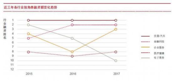 2017年,獨角獸公司年度融資總額排在前三位的行業是交通汽車、金融科技和企業服務。其中,交通汽車和金融科技領域在最近三年一直受到投資機構和投資人的熱捧。