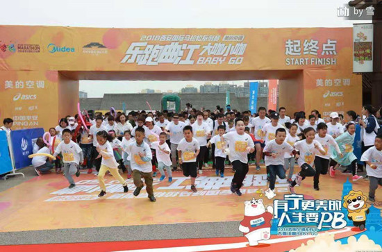 10月6日清晨九點,伴隨著涼爽的秋風,西安馬拉松配套賽—美的空調&蘇寧易購大咖小咖Baby Go在響亮的槍聲中活力開跑,近300組家庭1000位跑者迎著朝陽,在大明宮國家遺址公園出發、奔跑。