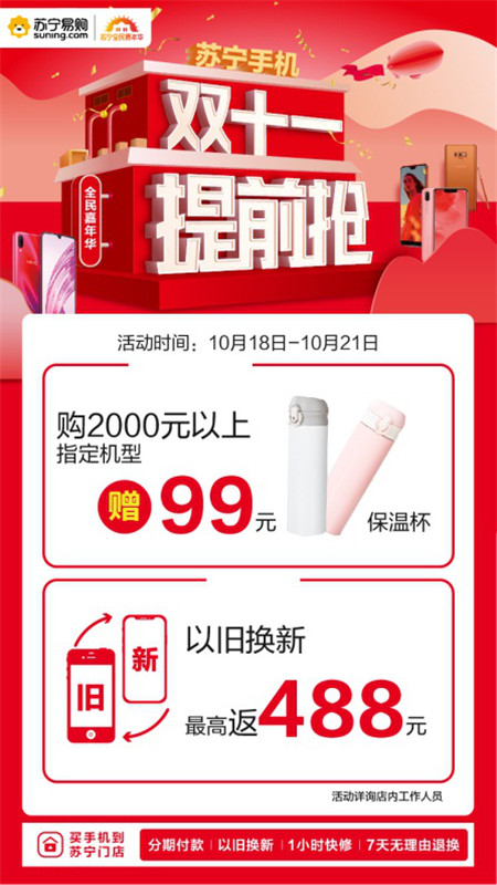 本次蘇寧手機“雙十一提前搶”活動,主要針對以舊換新業務,活動期間在蘇寧易購門店通過以舊換新購買新機,最高可返488元,同時購買2000元以上的指定機型,還可獲得獲贈保溫杯等各種禮品。