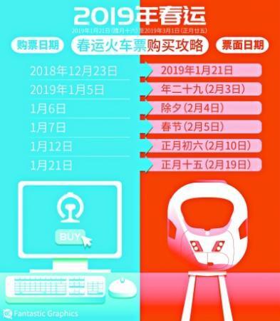 2019年鐵路春運(yùn)從1月21日起至3月1日止,共40天,節(jié)前15天,節(jié)后25天。全國鐵路預(yù)計(jì)發(fā)送旅客41330萬人次,同比增加3176萬人次,增長8.3%,日均發(fā)送1033萬人次,再創(chuàng)歷年春運(yùn)新高。鐵路春運(yùn)火車票互聯(lián)網(wǎng)和電話訂票提前30天發(fā)售,2018年12月23日,可以購買春運(yùn)第一天(2019年1月21日)的火車票,2019年1月6日可訂除夕當(dāng)天車票。