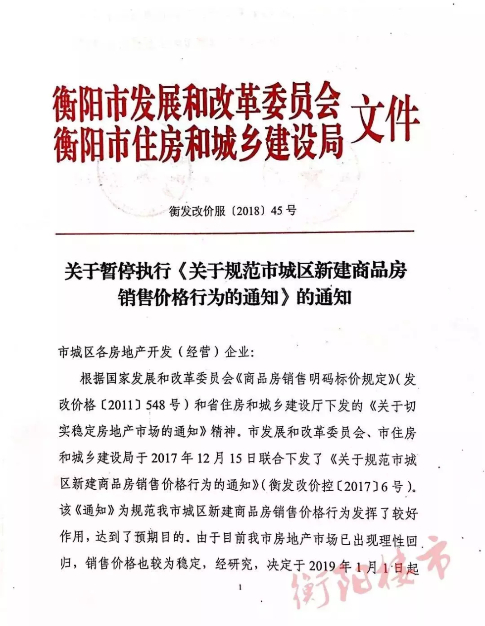 衡陽樓市微信公眾號26日公布衡陽發改委和住建局聯合下發的一份文件,自2019年1月1日起暫停執行此前的商品房限價政策。XF8安康新聞網