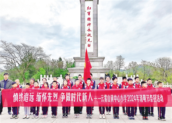 ▲ 4月1日,在清明節即將到來之際,石泉縣云霧山鎮中心小學組織部分少先隊員,在紅軍英雄紀念碑前開展愛國主義教育。譚相華 攝