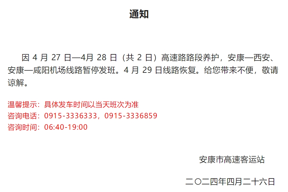 4月26日,安康高速客運站發布通知: