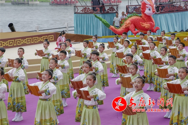 是日,遠(yuǎn)山如黛,近水碧綠,兩岸觀者如潮。“恭請(qǐng)先賢。”隨著主祭官洪亮的聲音響起,屈原雕像被緩緩護(hù)送到舞臺(tái)中央。百名童子,手持竹簡(jiǎn),齊聲詠頌祭文。緊接著,身著青綠漢服女子,一列走向江邊把竹籃里面的粽子拋入江中,追念先賢,另一列繞場(chǎng)為觀眾贈(zèng)發(fā)香包,送上祝福。