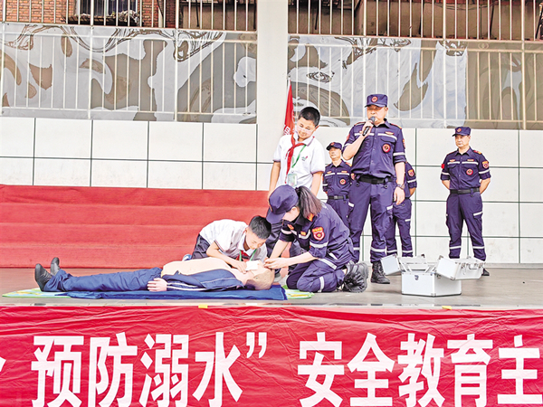 漢江志愿者救生隊(duì)進(jìn)學(xué)校開展防溺水知識演練。鄭時(shí)根 攝
