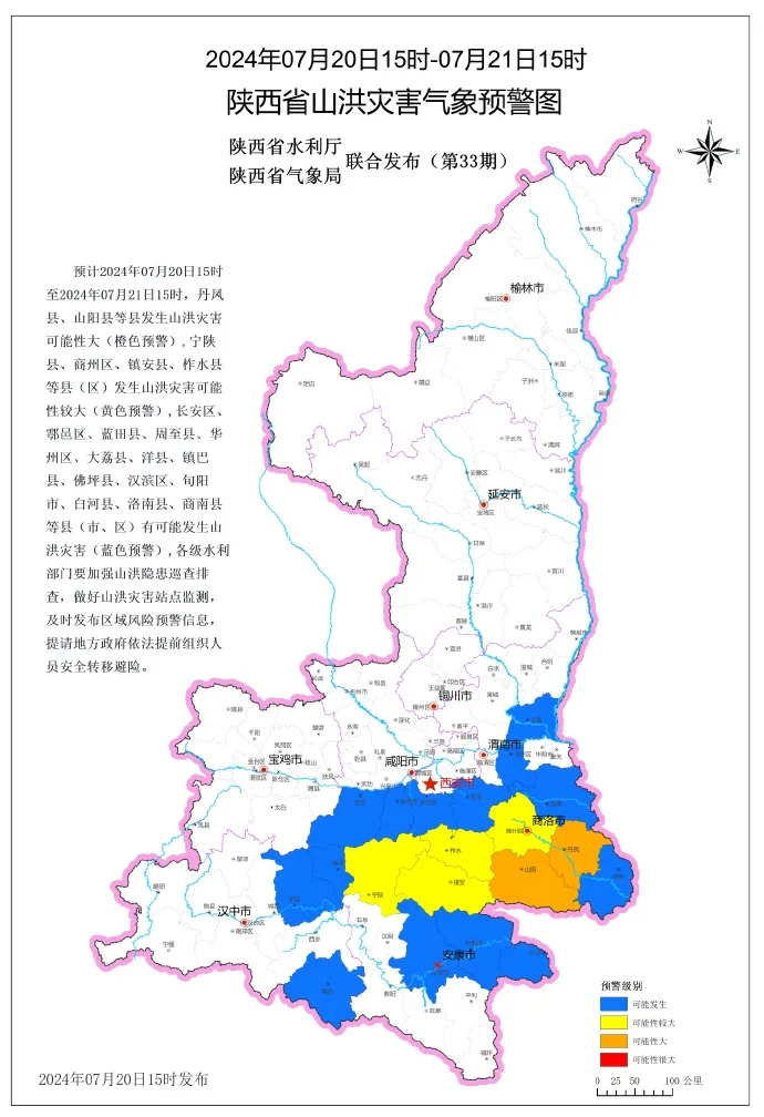 陜西省水利廳與省氣象局聯合發(fā)布山洪災害預警,預計7月20日15時至7月21日15時,下圖中所示縣(區(qū))可能發(fā)生山洪災害預警:其中我市寧陜縣發(fā)生山洪災害可能性較大(黃色預警),漢濱區(qū)、旬陽市、白河縣有可能發(fā)生山洪災害(藍色預警),各級水利部門要加強山洪隱患巡查排查,做好山洪災害站點監(jiān)測,及時發(fā)布區(qū)域風險預警信息,地方政府應依法提前組織人員安全轉移避險。