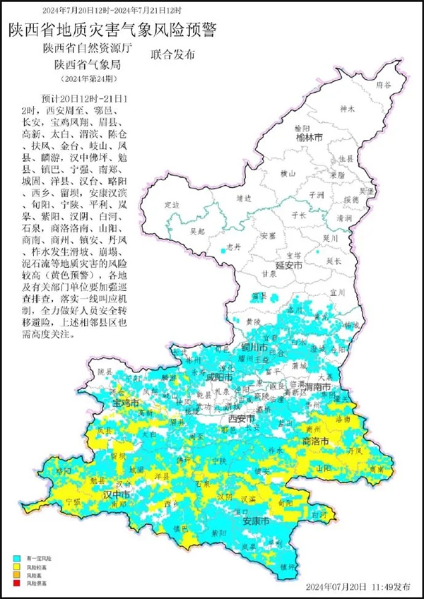 陜西省自然資源廳與省氣象局聯合發(fā)布地質災害氣象風險黃色預警,預計7月20日12時至7月21日12時,下圖所示縣(區(qū))可能發(fā)生地質災害:其中我市漢濱、旬陽、寧陜、平利、嵐皋、紫陽、漢陰、白河、石泉發(fā)生滑坡、崩塌、泥石流等地質災害的風險較高(黃色預警),各地及有關部門單位要加強巡查排查,落實一線叫應機制,全力做好人員安全轉移避險,上述相鄰縣區(qū)也需高度關注。