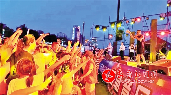 夜幕降臨,酷炫的舞臺霓虹閃耀、彩燈環繞、亮如白晝,音樂節在一曲《別非要我大聲說出來》中拉開帷幕,可容納千人的親水廣場人聲鼎沸、接踵摩肩,往來嬉戲游玩、親水樂水、觀看表演的群眾絡繹不絕。樂隊貝斯手、吉他手撥動琴弦,現場觀眾紛紛揮舞著手中的熒光棒,跟隨音樂盡情搖擺、合唱,隨著《稻香》《簡單愛》《夢醒時分》等一首首經典歌曲的演唱,現場氣氛熱烈、高潮迭起。TyU安康新聞網