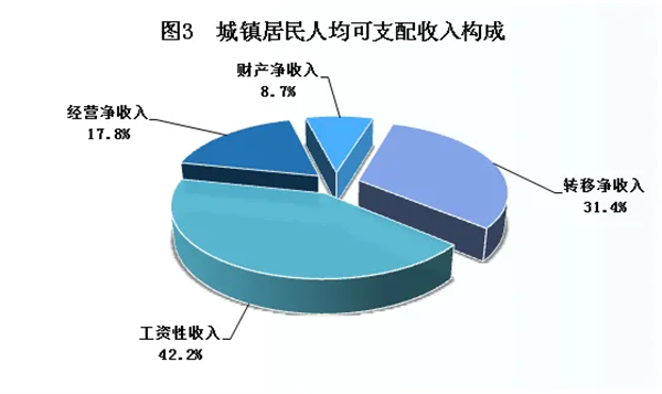 全市城鎮(zhèn)居民人均可支配收入33639元,比上年增加1663元,增長(zhǎng)5.2%。其中,工資性收入14181元,增長(zhǎng)5.0%,占可支配收入的比重為42.2%;經(jīng)營凈收入5995元,增長(zhǎng)4.7%,占比17.8%;財(cái)產(chǎn)凈收入2910元,增長(zhǎng)5.8%,占比8.7%;轉(zhuǎn)移凈收入10553元,增長(zhǎng)5.6%,占比31.4%。