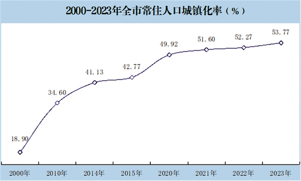 城鎮化步伐明顯加快。1949年,安康總人口146.75萬人,其中農業人口占89.4%,屬于典型傳統的農村社會,交通不便,人員相對封閉不流動。改革開放后,市場經濟體制逐步建立,特別是2000年撤地設市,對安康具有劃時代和里程碑的意義。2021年旬陽撤縣設市,成為陜南首個縣級市,標志著全市城鎮化步伐邁向更高水平。全市抓住東部勞動密集型產業向中西部轉移的機遇,依托易地搬遷集中安置點,大力興辦新社區工廠,把農民變為居民,大力開展新環境、新服務、新產業、新民風、新生活“五新”社區創建工作,完善配套設施,健全服務體系,城鎮化建設步伐顯著加快。2023年,全市戶籍人口300.75萬人,常住人口245.72萬人。常住人口城鎮化率由2000年的18.9%,提高到2023年的53.77%,23年間提高了34.87個百分點。3Rk安康新聞網