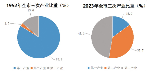 產業結構日趨優化。1952年,全市三次產業比為83.9︰2.5︰13.6,產業結構呈“一、三、二”模式,為典型的農業市,隨著工業經濟和第三產業的不斷發展,全市第一產業比重逐年下降,二、三產業比重逐年上升,2012年三次產業比為19.4︰42.7︰37.9,第一產業占比首次低于20.0%,第二產業突破40.0%,產業結構呈“二、三、一”模式;隨著第三產業不斷壯大,2020年占比45.3%,躍居三產之首,呈“三、二、一”模式,并連續保持4年,2023年全市三次產業之比15.0︰37.7︰47.3,以服務業為主的產業結構加速形成。3Rk安康新聞網