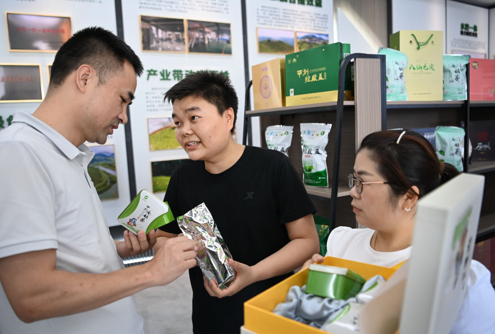 蔣家坪村民(中)向游客銷售茶葉。(平利縣委宣傳部供圖)jEa安康新聞網