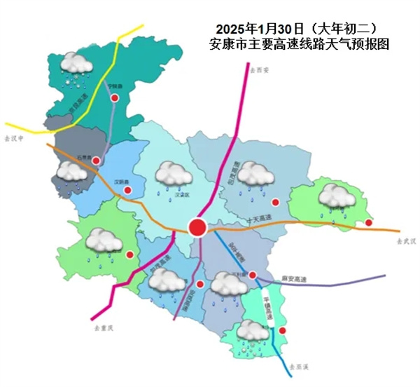 今天白天到明天白天我市有明顯的雨雪降溫天氣,春節期間,初二到初四(1月30日至2月1日)有弱的雨雪降溫天氣,恰逢春運春節返鄉、旅行等出行高峰時段,包茂高速、麻安高速、十天高速、G541等高速及秦嶺和巴山高山的部分路段需注意道路濕滑、結冰,低能見度對交通安全的不利影響,防范雨雪天氣造成的道路擁堵和交通事故;公眾行車注意小心慢行。其余時段我市天氣較利于出行。