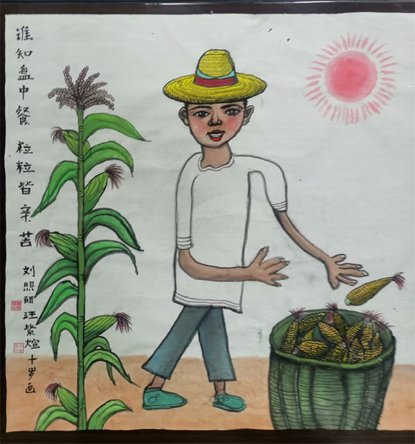 四年級(jí)的汪紫煊在參加夏令營(yíng)時(shí),在玉米田里看到一幕,深深地吸引了她,一位農(nóng)民伯伯戴著草帽在烈日下,把玉米裝進(jìn)筐里。曾經(jīng)學(xué)過的詩(shī)句在她腦海里浮現(xiàn),文字變成了立體的畫面,她為自己這幅畫起名《誰(shuí)知盤中餐 粒粒皆辛苦》。汪紫煊覺得,這種吃苦耐勞的精神要發(fā)揚(yáng),更要珍惜糧食,感受糧食的來(lái)之不易。