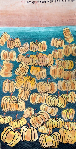 畫面上緊密排列的南瓜,給人一種飽滿、充實(shí)的視覺感受,顯示了收獲的豐盛,也表達(dá)出一種對(duì)富足生活的滿足和喜悅之情。汪佳涵選擇了家鄉(xiāng)常見的農(nóng)作物作為自己的繪畫主題,直白地表達(dá)了對(duì)家鄉(xiāng)的認(rèn)可和贊美,展示了她對(duì)家鄉(xiāng)生活的認(rèn)同和熱愛。