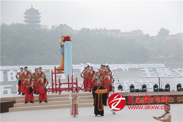 活動現場,6聲渾厚鐘聲劃破長空。“緬懷先賢……”隨著主祭官畫外音傳來,60名身著青綠漢服的女子手捧香粽菖蒲,踏古琴清音翩躚而出。屈原塑像被緩緩護送入舞臺中央,112名身著漢服的學童齊聲詠頌祭文的聲浪在江岸回蕩。隨著粽拋碧波,香囊、梔子花贈客,流淌千年的龍舟文化,化作平安順利、幸福安康的當代回響。