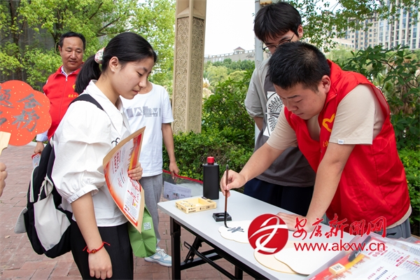 “翰墨飄香,助力高考”書法創(chuàng)作活動(dòng)中,書法愛好者揮毫?xí)荆瑢㈧`動(dòng)筆墨化作滿滿的祝福,為考生加油鼓勁。