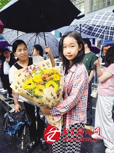 6月7日上午,安康中學考點外妹妹正手捧鮮花等待完成第一場考試的姐姐。 鄭時根 攝fed安康新聞網