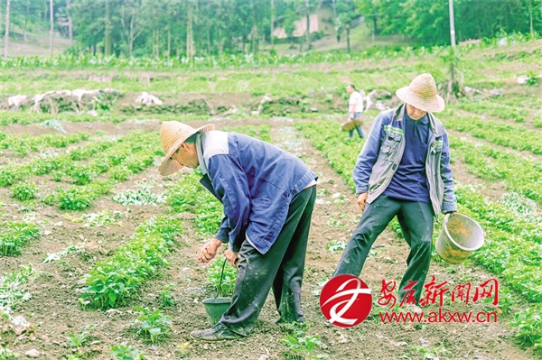 近日,雨后的嵐皋縣藺河鎮蔣家關村牡丹花育苗基地里,村民們正忙著給牡丹花苗除草、施肥。 邱苗 攝2N2安康新聞網
