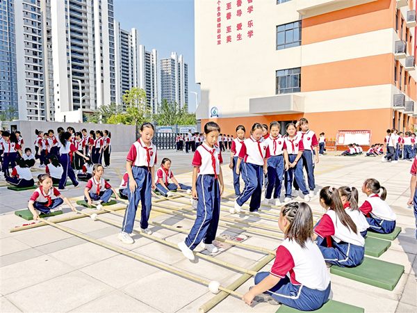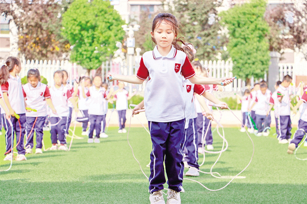 這所建校僅一年多的學(xué)校,通過創(chuàng)新構(gòu)建“138+X”體育活動(dòng)體系,讓體教融合從理念走向?qū)嵺`。“‘1’是每天10分鐘眼保健操,‘3’是30分鐘體育課,‘8’是80分鐘大課間,‘X’則是清晨微鍛煉和社團(tuán)活動(dòng)。”該校體育教研組組長(zhǎng)陳波介紹道,“通過科學(xué)規(guī)劃,我們確保每個(gè)孩子每天都能享受2小時(shí)的運(yùn)動(dòng)時(shí)光。”這一體系的設(shè)計(jì),正是對(duì)中共中央、國(guó)務(wù)院提出的“中小學(xué)生每天綜合體育活動(dòng)時(shí)間不低于2小時(shí)”要求的創(chuàng)新落實(shí),也體現(xiàn)了學(xué)校對(duì)“健康第一”教育理念的深刻理解。