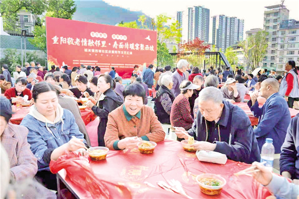 10月28日,嵐皋縣城關(guān)鎮(zhèn)西坡社區(qū)舉辦了“重陽敬老情融鄰里·壽面?zhèn)髋缇畚髌?rdquo;主題活動(dòng)。廖霖 攝