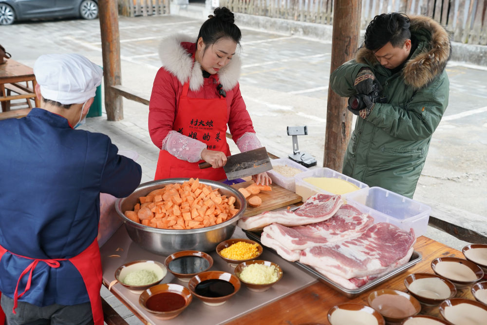 2月21日,在安康市漢濱區(qū),李花(中)在她的農(nóng)家樂院內(nèi),制作準備用于網(wǎng)絡(luò)銷售的蒸碗,并拍攝短視頻。李花和丈夫從經(jīng)營農(nóng)家樂起步,后通過短視頻和直播等方式,在……