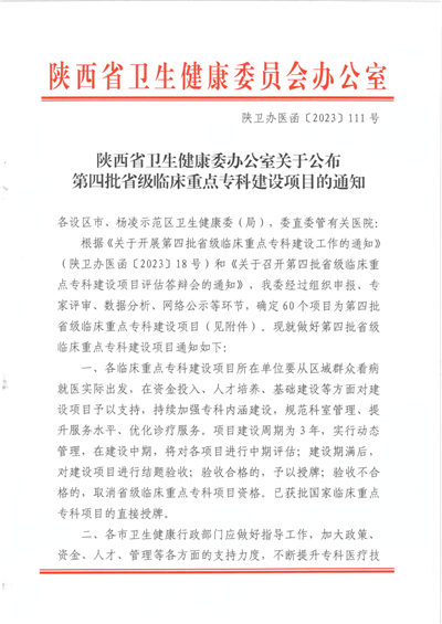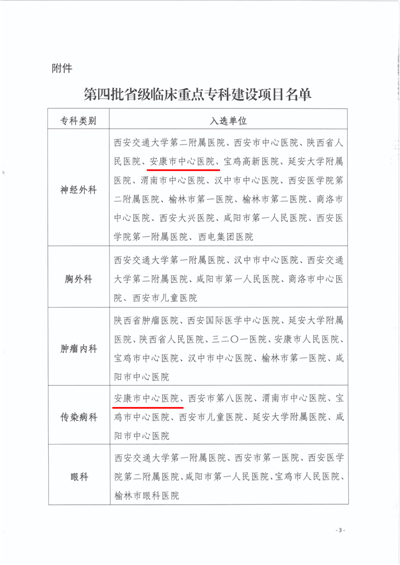 近日,陜西省衛健委辦公室印發了《關于公布第四批省級臨床重點專科建設項目的通知》,市中心醫院神經外科、傳染病科和檢驗醫學科入選第四批省級臨床重點專科建設項目。截至目前,我院共有省級臨床重點專科2個(心血管內科、新生兒科),省級臨床重點專科建設項目10個(神經內科、呼吸與危重癥醫學科、泌尿外科、醫學影像科、消化內科、麻醉科、護理學、神經外科、傳染病科、檢驗醫學科)。