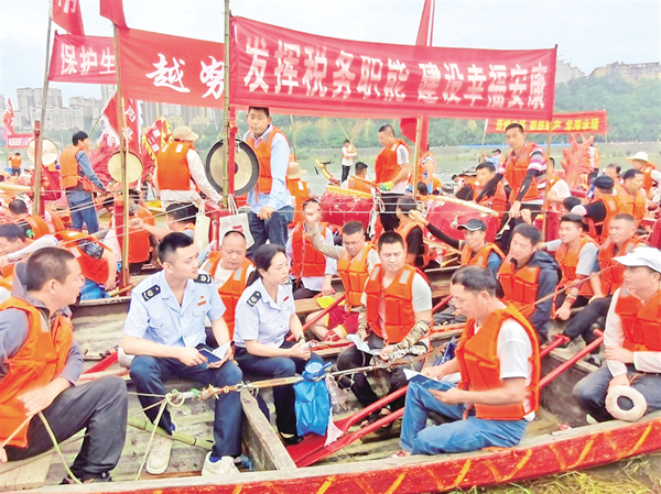 6月20日,漢濱區稅務局納稅服務小分隊走進龍舟節主會場,向龍舟隊員和市民介紹稅費征繳政策。陳榮斌 攝hRd安康新聞網