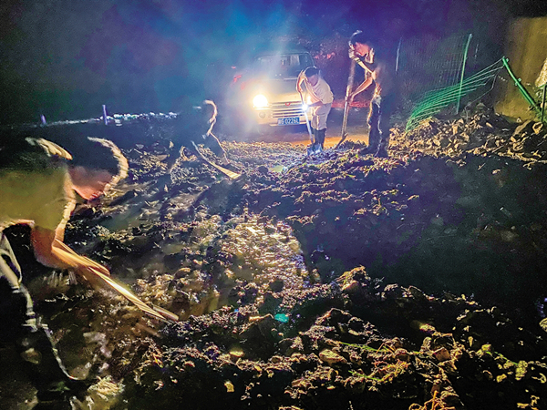⇑ 9月20日,嵐皋縣民主鎮農田社區山洪沖上路面,鎮黨委、政府和社區黨支部立刻組織網格員、應急搶險隊到一線抗洪搶險。陳城 攝