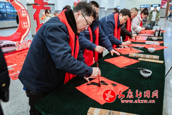 活動另一邊,7名來自安康地區的鐵路書法家們在候車室內揮毫潑墨,一氣呵成,將一副副飽含著美好祝愿的春聯和一張張洋溢著節日喜慶的“福”字送到旅客手中,讓旅客的春運旅途充滿濃濃“年味”。URi安康新聞網