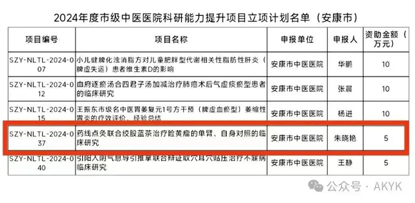 立項(xiàng)二:藥線點(diǎn)灸聯(lián)合絞股藍(lán)茶在黃素瘤應(yīng)用項(xiàng)目獲陜西省中管局市級中醫(yī)醫(yī)院科研能力提升項(xiàng)目(朱曉艷、袁銘悅)